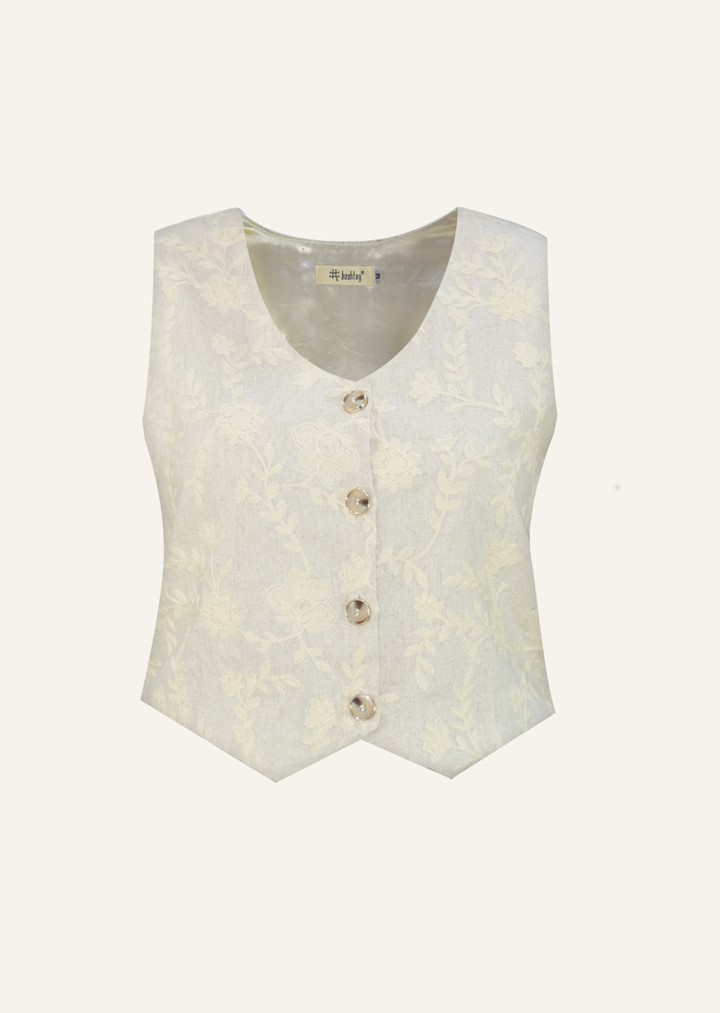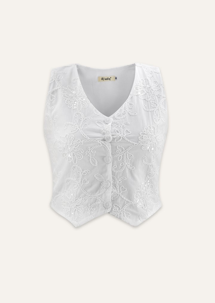 Chaleco elaborado en tela de algodón, de tacto suave y estructura liviana, ideal para climas cálidos. Presenta bordados decorativos y lentejuelas , que aportan un detalle artesanal y distintivo. De corte recto y sin mangas, este diseño incluye escote en “V” y  con botones, lo que permite llevarlo abierto o cerrado según el estilo deseado.