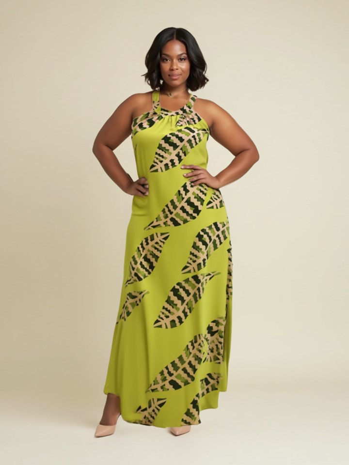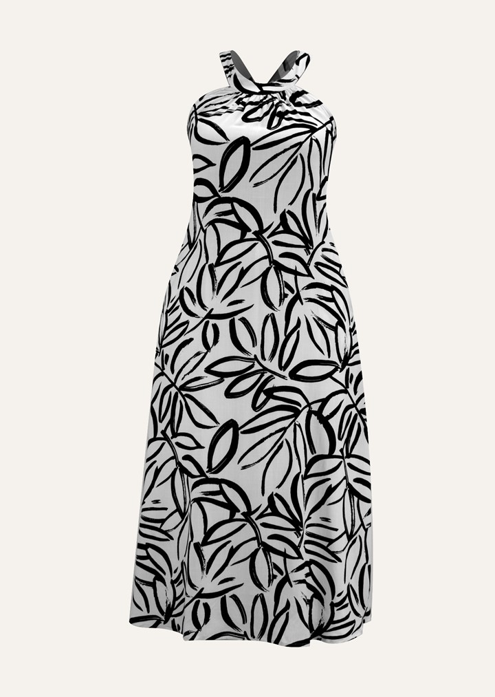 Este vestido destaca por su diseño elegante y atrevido, con un cuello halter que estiliza los hombros y deja al descubierto la parte superior de la espalda. El detalle más llamativo está en la parte posterior: un entrelazado de tiras cruzadas que forma un patrón atractivo, ajustable y visualmente impactante.